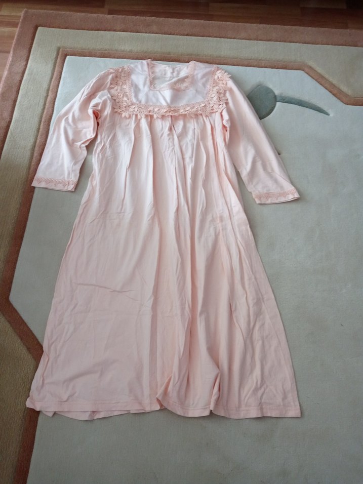 Pembe renk, uzun kollu, midi boy rahat kesim gecelik, zarif yaka detaylarıyla konforlu ve sade tarz sunar.