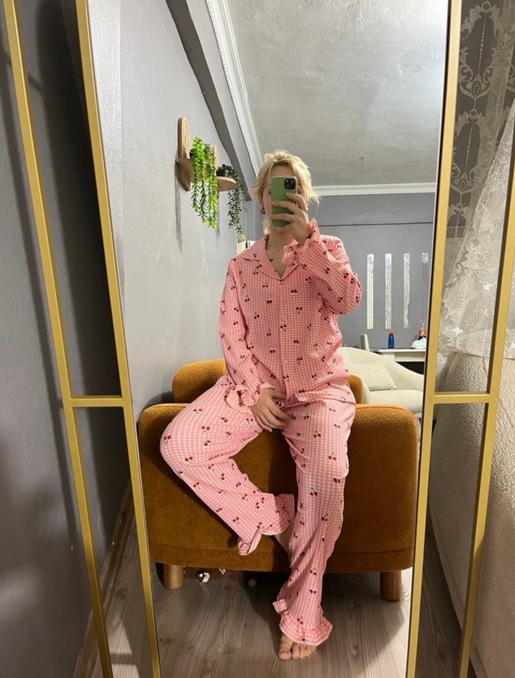 Pembe Uzun Kollu Midi Pijama Takımı