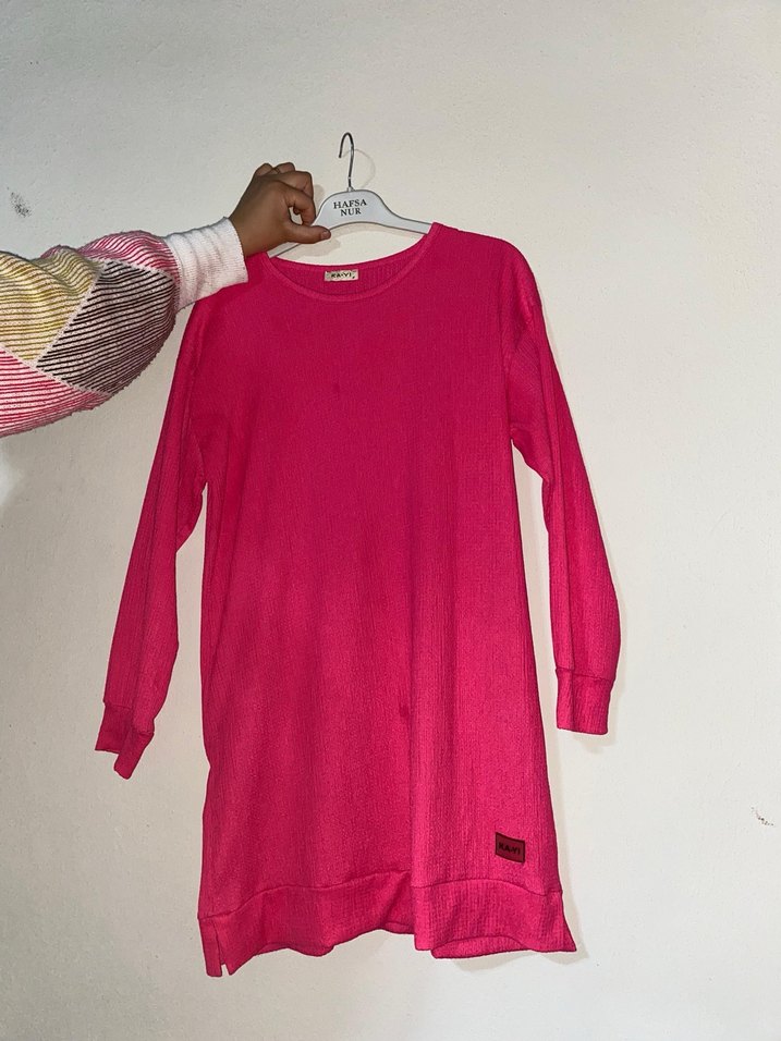 Pembe renkli midi tunik, uzun kollu ve yuvarlak yakalıdır. Yumuşak ve sıcak örme kumaştan yapılmış, renkli batik desene sahiptir. Rahat sokak stili için uygundur.