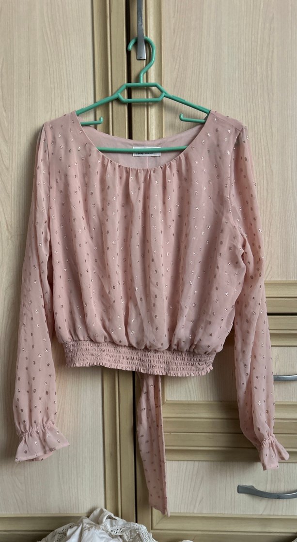 Pastel pembe renkte, uzun kollu ve fırfırlı detaylara sahip, yuvarlak yakalı, bol kesim mini bluz. Yumuşak sentetik kumaştan, günlük kullanıma uygun bohem tarz. Çocuk reyonundan aldım ama s bedene kadae olur hiçbir sıkıntısı yok 1 kere giydim düğünde o kadar.