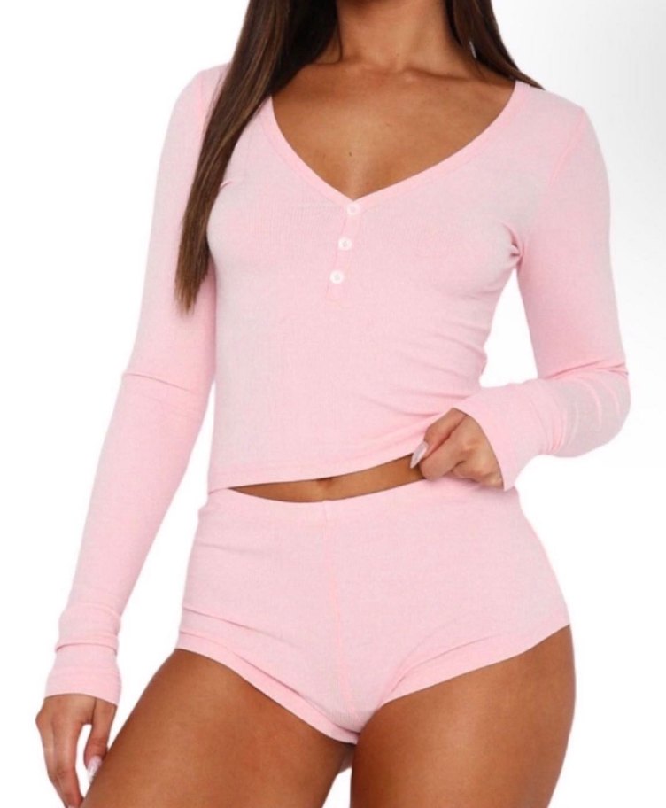 Pembe, düğmeli uzun kollu üst ve kısa şortlardan oluşan, rahat ve pastel tonlarda mini pijama takımı.