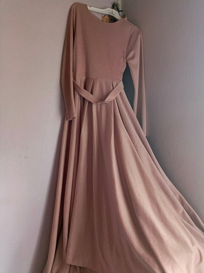 Pembe renkte, uzun kollu, yüksek yakalı, dökümlü ve bol kesim modern klasik elbise, yumuşak sentetik kumaştan üretilmiştir. Minimalist tarzıyla düğünlere uygundur. çok az çekilmesi var