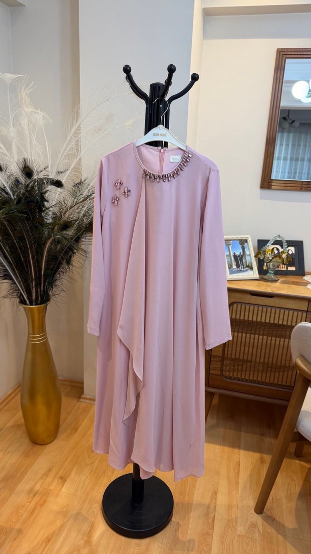 Pastel pembe renkli, uzun kollu, nakış detaylı ve drapeli kadın elbisesi. Yuvarlak yakalı ve bol kesim, düğünler için uygun klasik şıklıkta. 1 adet deformesi mevcuttur takıl şeklindedir 2 kere kullanıldı