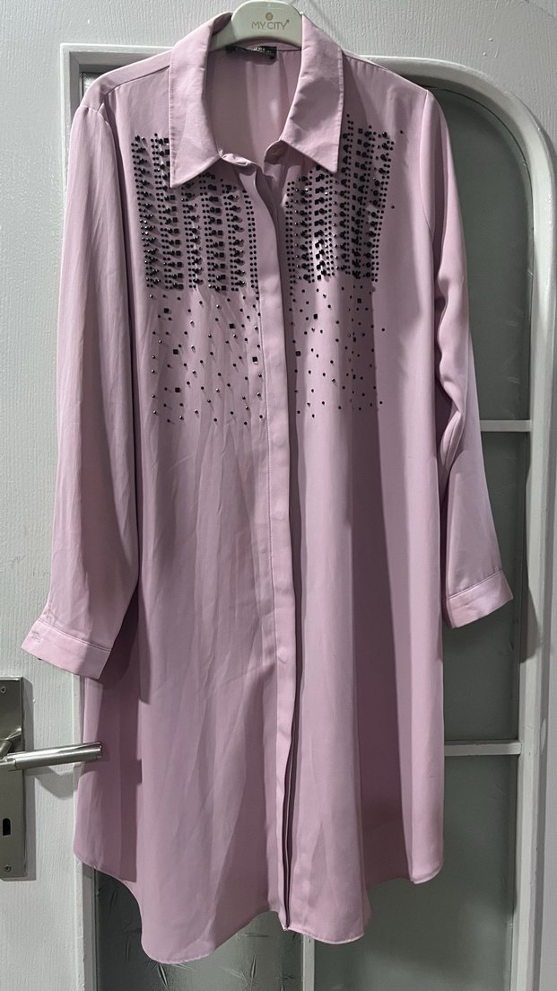 Bol kesim uzun pembe tunik, uzun kollu, çıtçıtlı ve yakası kesik detaylıdır. Ön kısmında siyah nakış süslemeler bulunur, yumuşak sentetik kumaştan üretilmiştir.