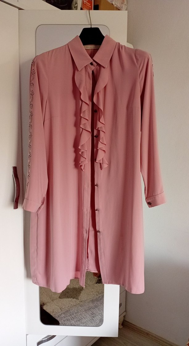 Pembe pastel tonlarında, uzun kollu, nakış detaylı ve önde fırfır süslemeli bohem tarzda uzun tunik. hafif sorunları var.
