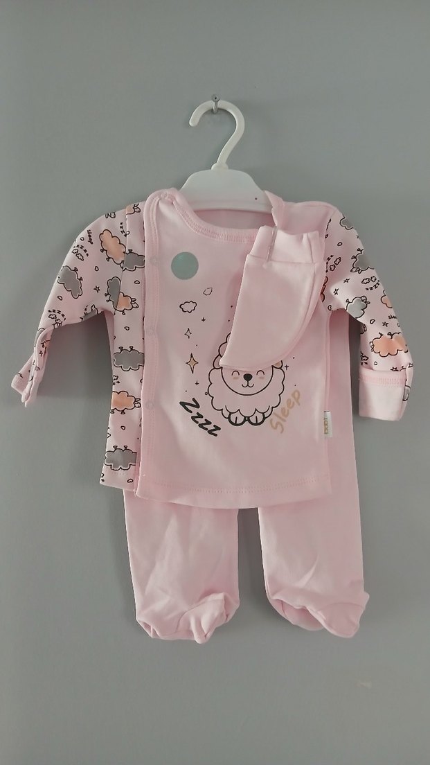 Pembe renkli, uzun kollu ve örgü dokulu bebek kız takımıdır. Bulut ve uyuyan kuzu baskılı desenleriyle rahat ve sıcak tutar.
