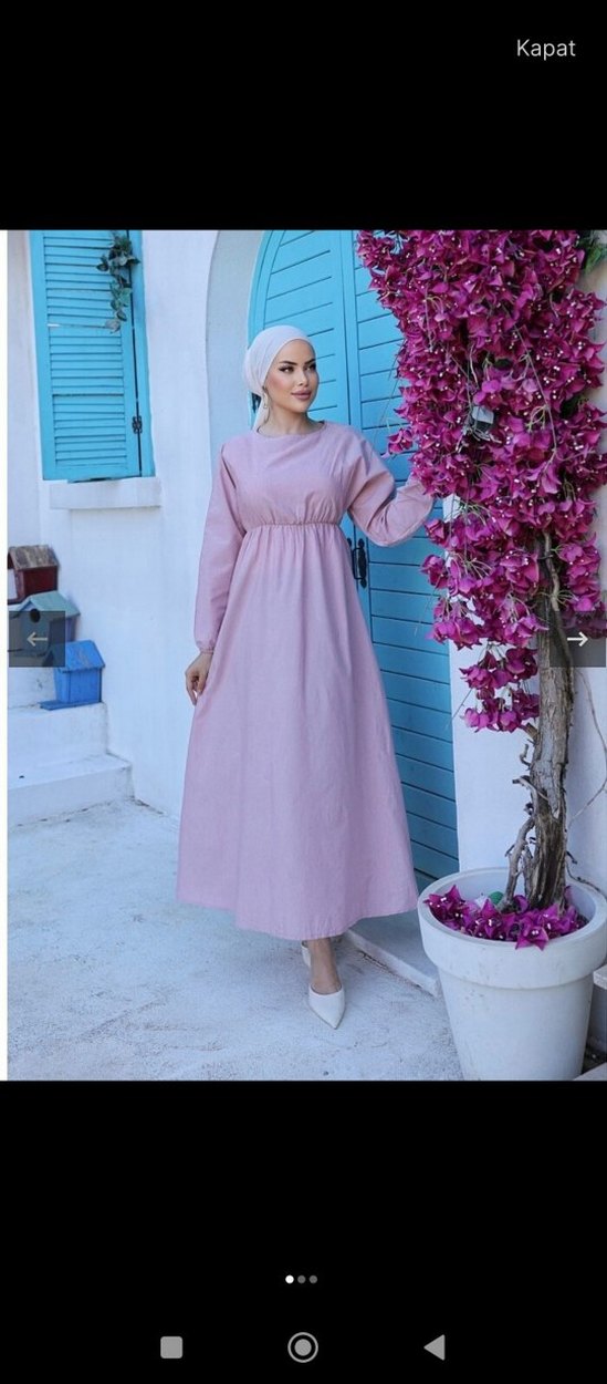 Pastel pembe renkte, uzun kollu ve tek renk pamuklu kumaştan yapılmış, bol kesim ve tekne yaka uzun elbise. Günlük kullanıma uygun, zahmetsiz şıklık sunar. kaç kez giyilmiştir hiçbir sıkıntısı yok