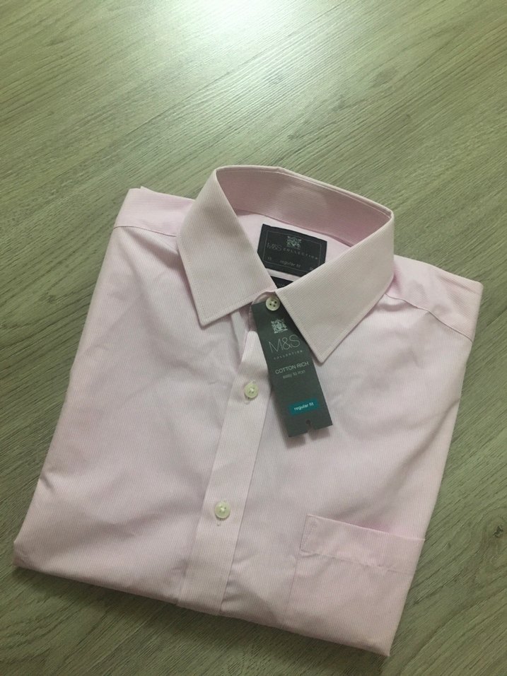 Pembe renkte, pamuklu kumaştan yapılmış, uzun kollu düğmeli klasik yakalı erkek gömleği.