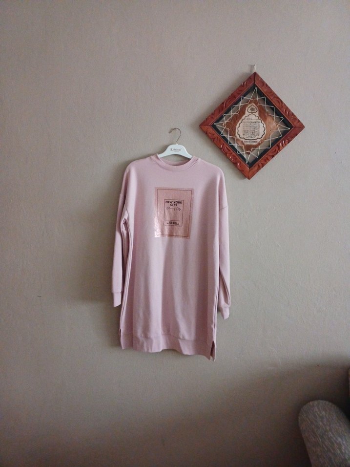 Pamuklu, pembe tonlarında, uzun kollu, ve bol kesim sweatshirt. Önünde baskı deseni bulunur, rahat ve şık bir günlük tercih.