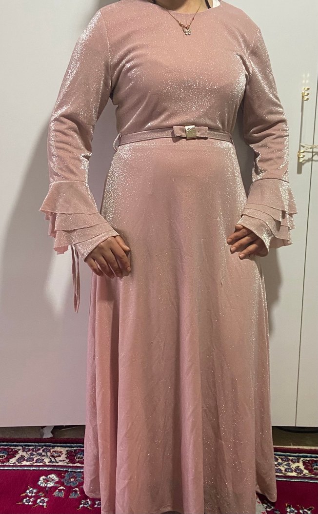 Pembe renkli, uzun ve parlak kumaştan, yüksek yakalı, uzun katlı kollu, drapeli ve beli kemerli klasik şıklıkta abiye elbise. Düğün için uygundur.