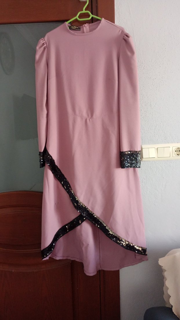 Pembe renk, uzun kollu kadın abiye elbise, parlak siyah payet detaylı manşet ve etek ucu ile. Notch yaka ve regular kesim, düğünler için uygundur. ✨