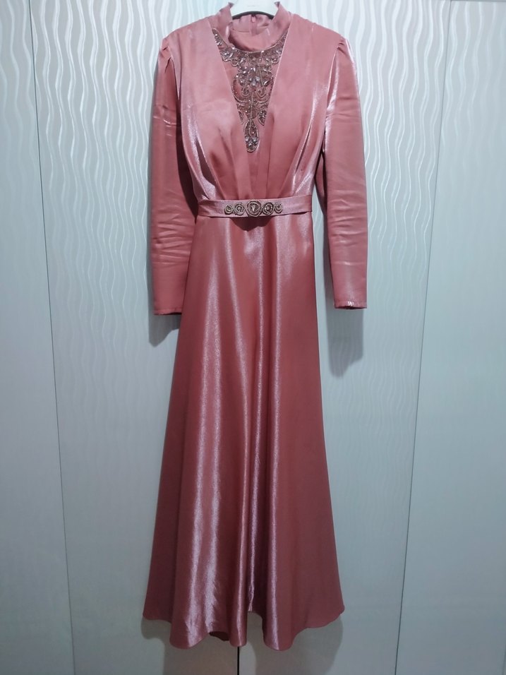 Pembe Uzun Kollu Parlak Kadın Abiye Elbise