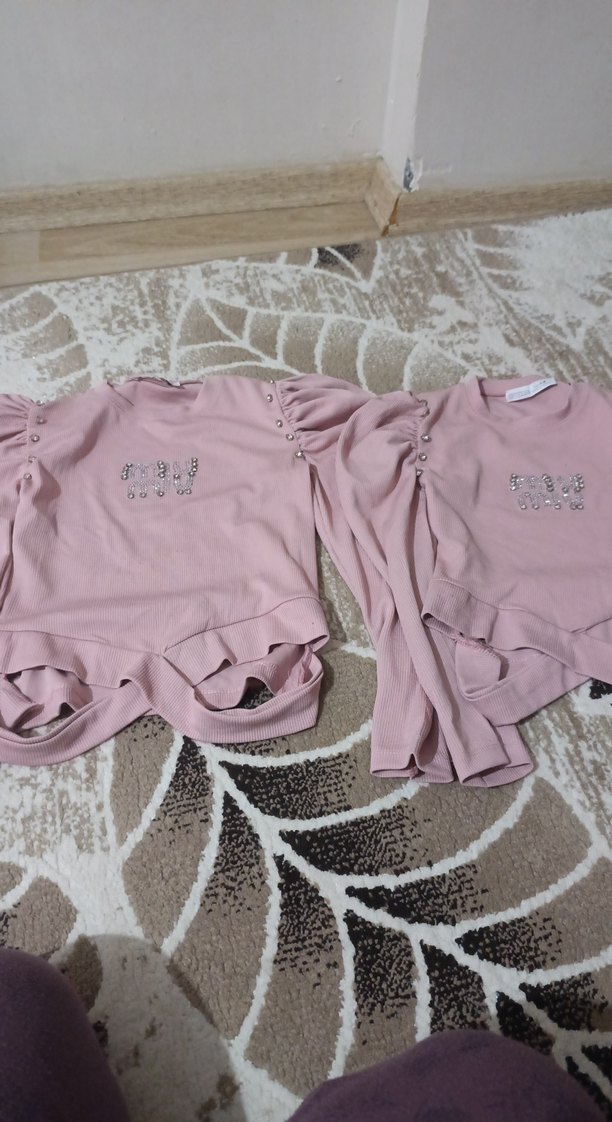 Pastel pembe renkte, uzun kollu ve payetli baskılı detaylara sahip ust bir 10 yaş biri 8 yaş