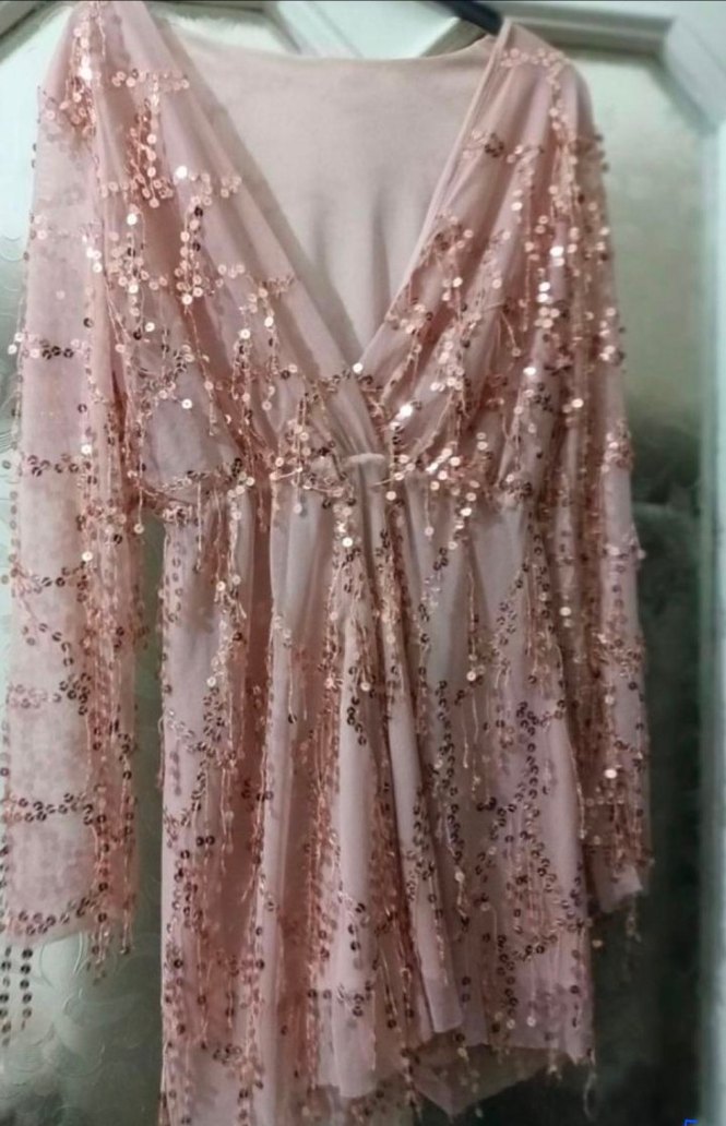 Pembe uzun kollu, V yaka elbise. Payetli ve nakışlı detaylarıyla bol kesim, gösterişli parti stiline uygun...XS.SMALL UYUMLUDUR