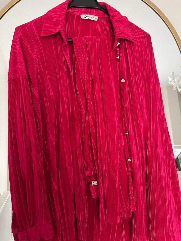 Uzun, bol kesim kadın gömlek; pilili detayları, parlak pembe sentetik kumaş