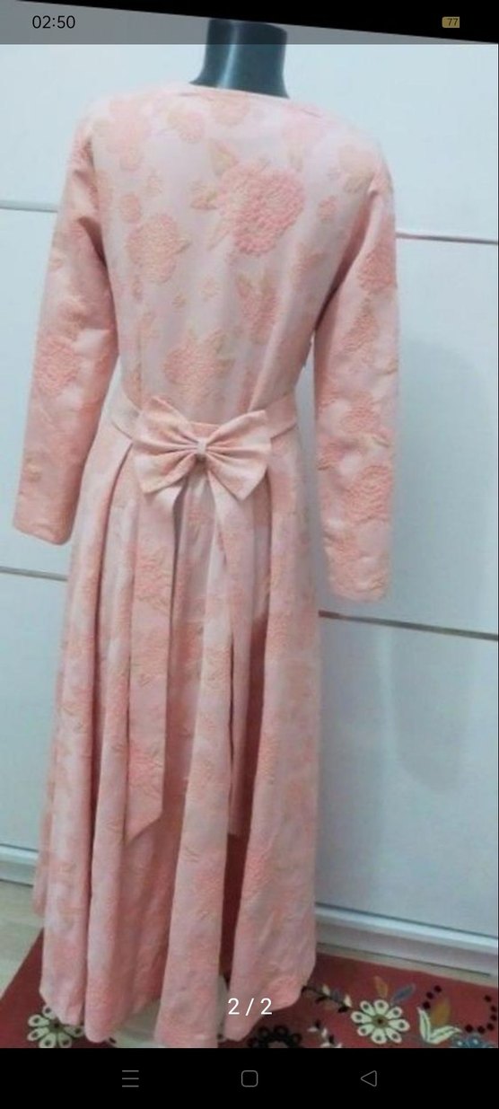Pembe uzun kollu kadın elbise, piliseli tasarım ve sırtında fiyonk detayıyla dikkat çeker. Yumuşak sentetik kumaştan, klasik ve vintage şıklıkta, düğünler için uygundur.
