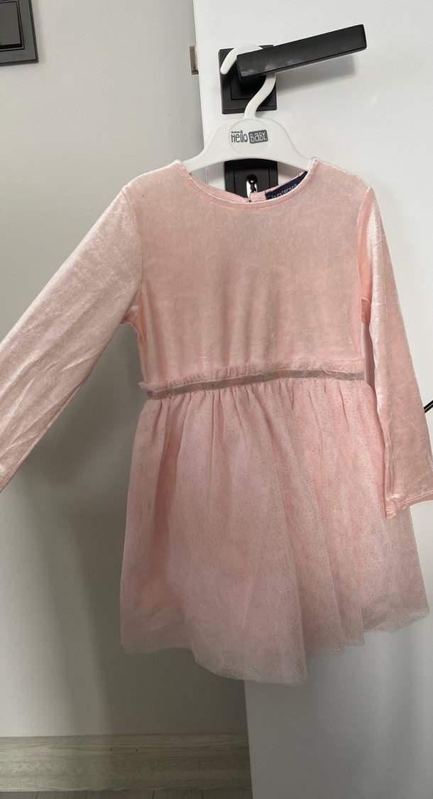 Pastel pembe renkli, uzun kollu, yuvarlak yakalı, piliseli detaylı ve bol kesim kız elbisesi. Yumuşak sentetik kumaştan üretilmiştir.