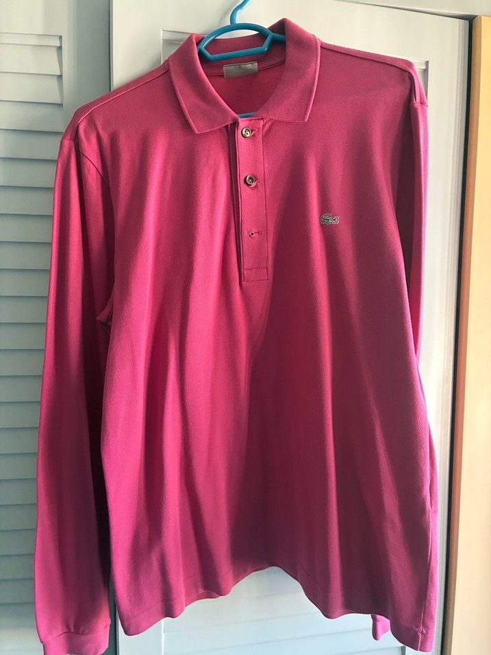Erkekler için uzun kollu, düğmeli polo yaka tişört. Bol kesim ve parlak pembe, ipeksi kumaşla günlük sokak stiline uygun.