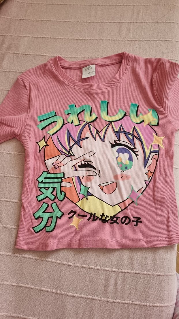 Pembe renkli, uzun kollu, bol kız tişörtü. Canlı pastel tonlarda, anime tarzı baskılı ve bisiklet yaka.