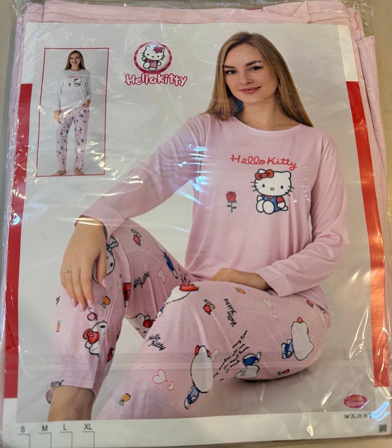 Uzun kollu, bol kesim pembe pijama takımı, Hello Kitty baskılı rahat kumaştan üretilmiştir. Konforlu ve şık bir uyku kıyafeti.