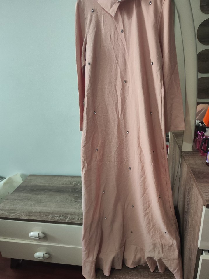 Pastel pembe renkte, uzun kollu ve V yakalı, salaş ve drapeli kesime sahip uzun elbisedir. Günlük kullanıma uygun, sade ve mütevazı tarzdadır.