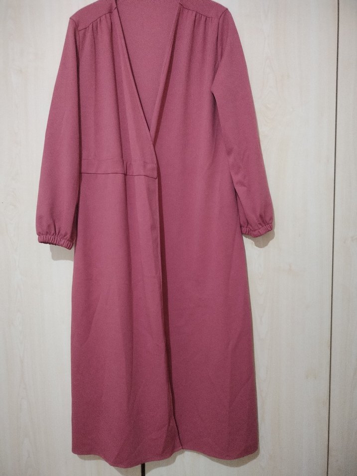 Pastel pembe renkte, uzun kollu ve salaş kesimli uzun boy kadın elbise. Minimalist, normcore tarzda, desensiz sade bir modeldir.