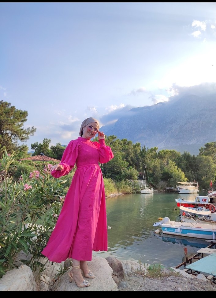 Yüksek yakalı ve uzun kollu, pembe uzun ve salaş kesim kadın elbisesi. İpek gibi kumaştan, drapeli ve pastel tonlarda batik desenlidir, sade ve tesettür stiline uygundur.