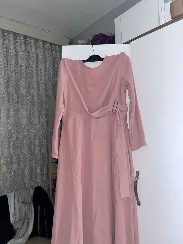 Pembe renkte, uzun kollu ve salaş kesimli bu elbise, drapeli detaylar ve tekne yaka ile minimal bir tarz sunar. Günlük kullanıma uygundur.