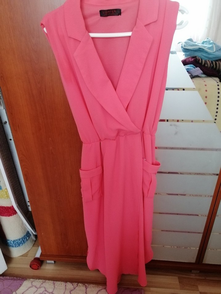 Pembe, kolsuz, uzun boy ve salaş kesim kadın elbise. Yaka detaylı ve cepli, pastel Paris tarzını yansıtıyor.