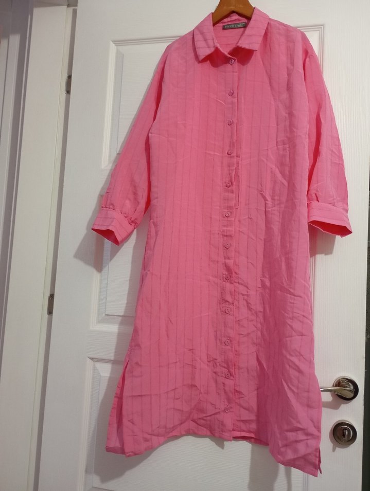 Pastel pembe renkte, uzun kollu ve düğmeli ön cepheli, salaş kesim kadın elbisesi. Minimalist ve normcore tarzda, desensizdir.