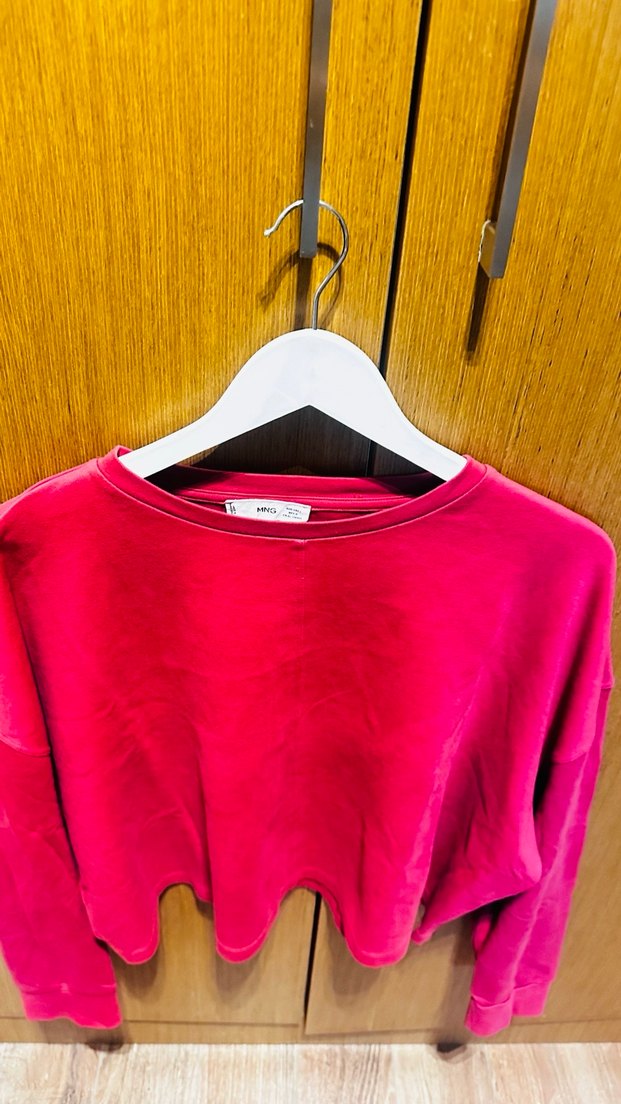 Pembe renkli, yuvarlak yakalı, uzun kollu ve salaş kesim kadın sweatshirtü, yumuşak ve sıcak kumaştan üretilmiştir. Normal boyda ve renkli batik desenlidir.