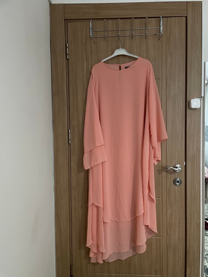 Pembe pastel tonlarda, uzun kollu ve salaş kesimli, kat kat drapeli kadın elbise . İpeksi kumaştan, sade ve mütevazı stil sunar.