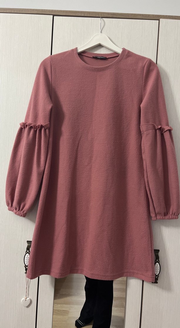 S-M uyumlu.Pembe renkli, uzun kollu ve salaş kesimli bu tunik, kollarında volan detaylarına sahiptir. Yuvarlak yakalı ve yumuşak, rahat bir kumaştan üretilmiştir.kullanım kaynaklı hafif topaklanmalar var görselde mevcut.
