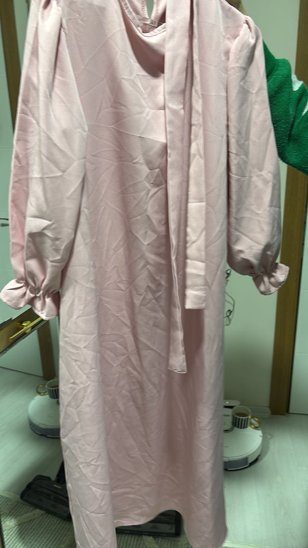 Pastel pembe renkte, uzun kollu ve salaş kesim uzun elbise. Yumuşak sentetik kumaştan, drapeli ve yüksek yakalı tasarımıyla sokak modasına uygun.