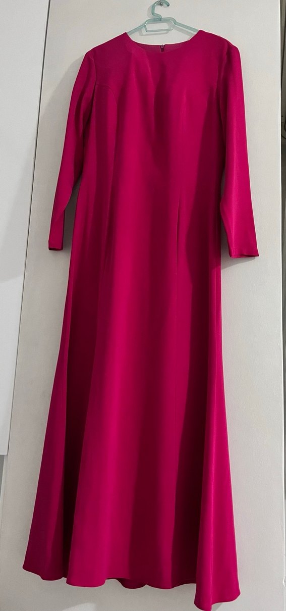 Koyu pembe renkte, saten dokulu, drapeli ve kayık yaka uzun elbise. Uzun kollu ve klasik kesim, düğünler için uygun.