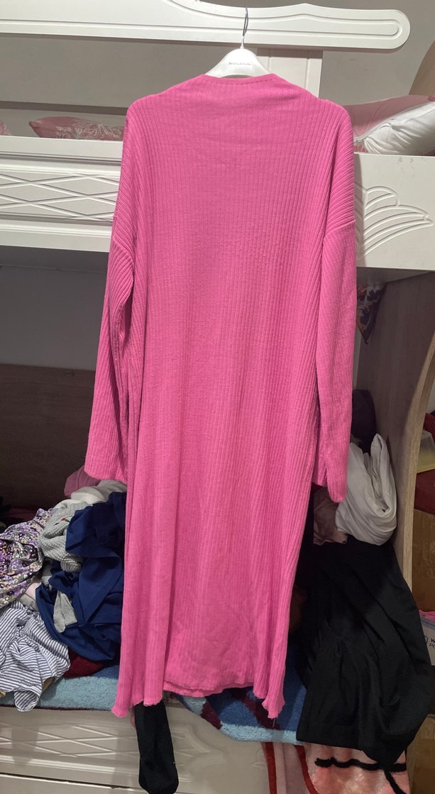 Pembe pastel renkte, uzun kollu ve boğazlı yakalı uzun triko elbise. Yumuşak sentetik kumaştan, rahat ve gündelik kullanıma uygun.