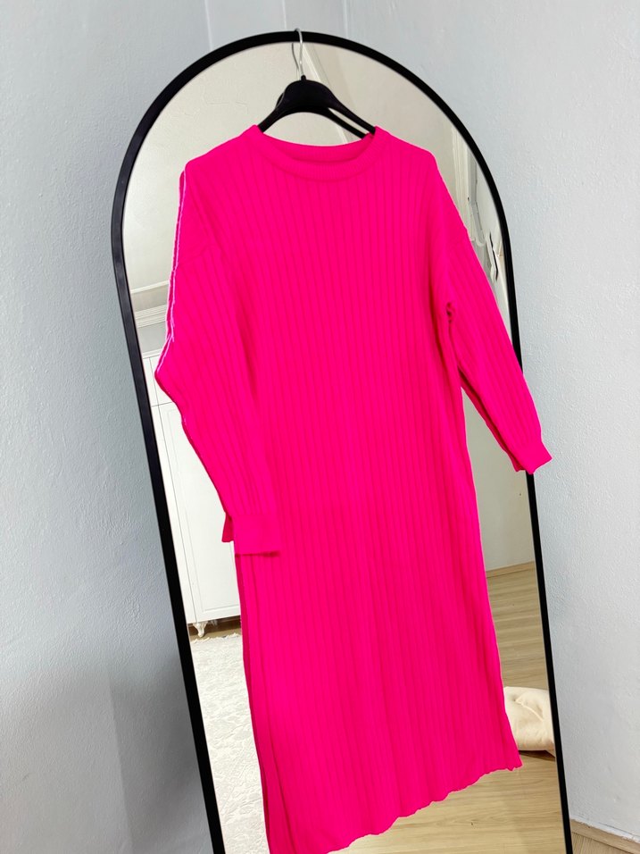 Pembe renkli, uzun kollu triko elbise. Yumuşak sentetik kumaştan örülmüş, rahat ve renkli görünüme sahip günlük kullanım elbisesi. 110 cm Uzun botlar üstüne tercih edilir