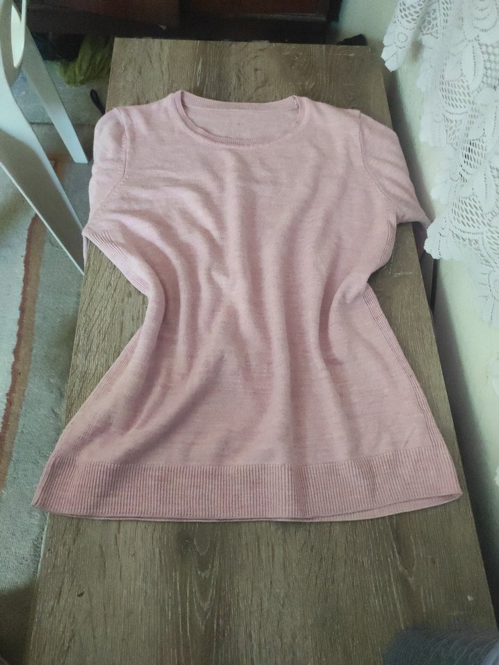 Pembe renkli, uzun kollu, yuvarlak yaka kadın triko kazak. Yumuşak keten kumaştan, rahat kesim ve normal boyda, günlük kullanım için uygun.