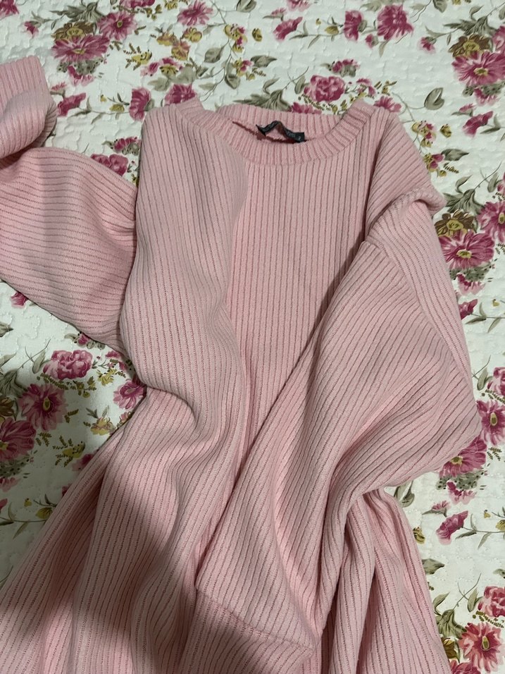 Pembe uzun kollu, gevşek kesim, örme dokulu kadın kazak, yumuşak kadife dokulu kumaştan günlük kullanım için uygundur.