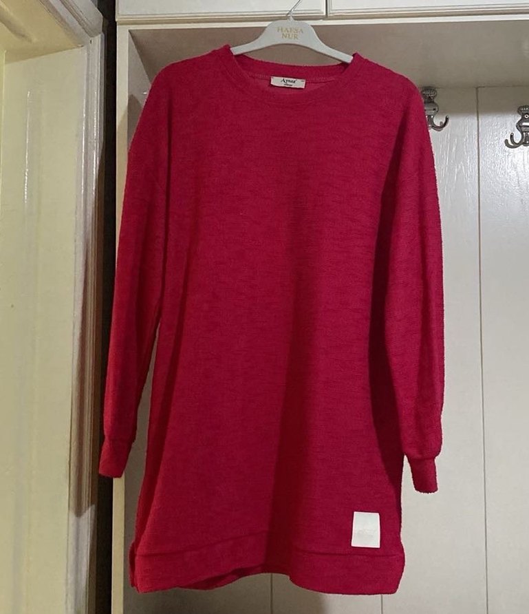 Koyu pembe renkli, uzun kollu, triko dokuma midi tunik. Yuvarlak yaka ve bol kesimiyle rahat ve sıcak bir günlük stil sunar.