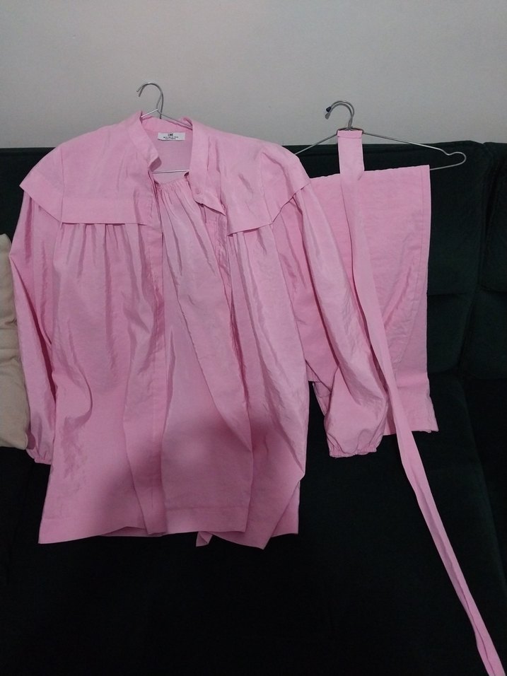 Pembe pastel renkte, uzun ve bol kesim kemerli takım.alt beli lastikli üst bol kesim kemerle beden ayarlanabilir.
