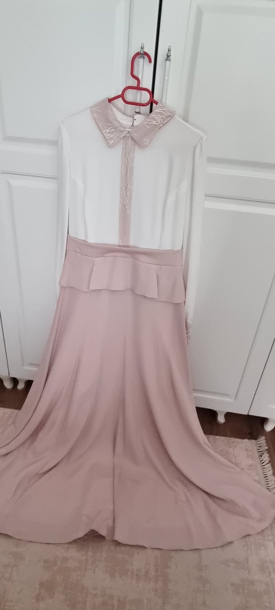Pembe uzun kollu, tek renk, klasik kesim ve tekne yaka abiye elbise, bel kısmında fırfır detayına sahiptir. Düğün için uygundur.