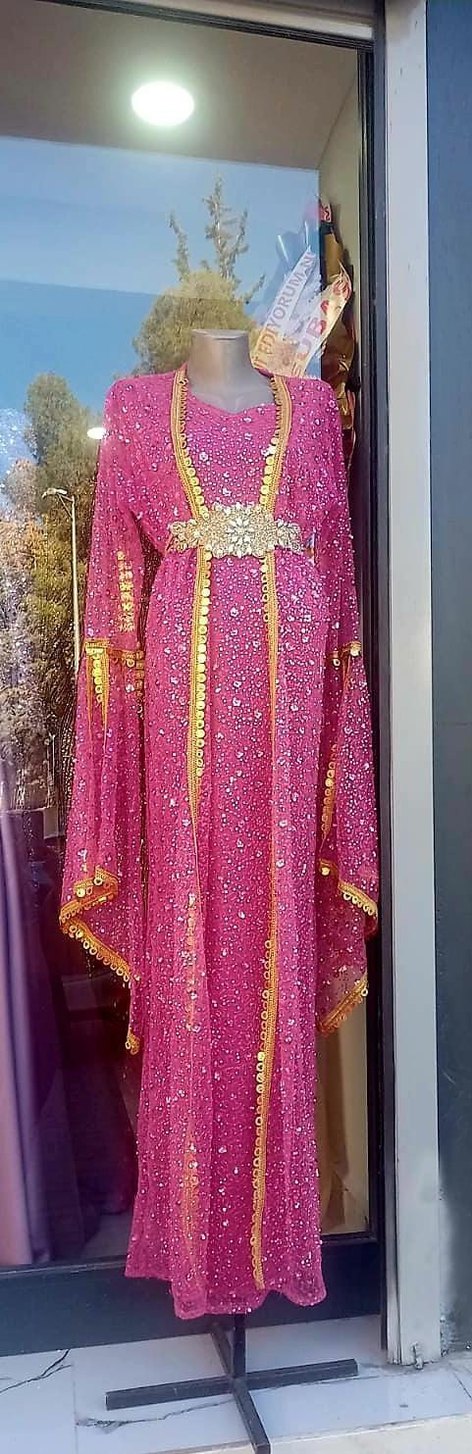 Pembe renkli, uzun kollu ve V yakalı henna elbise. Salaş kesimli, drapeli ve renkli desenlerle süslenmiş, altın detaylar içerir. Düğünler için uygun.