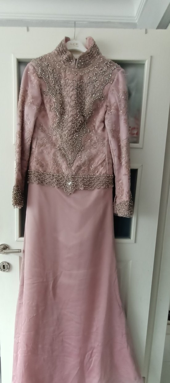 Pembe Uzun Kollu Vintage Abiye Elbise
