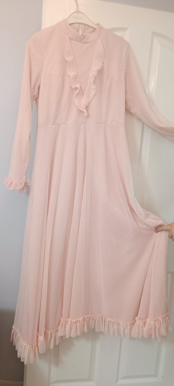 Pastel pembe uzun elbise, bol kesim ve V yakada volan detaylarıyla. Yumuşak sentetik kumaştan, klasik ve bohem stil için uygun.