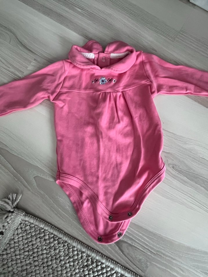 Pastel pembe, yakalı ve uzun kollu bebek body. Düğmeli ve göğüs kısmında küçük çiçek detaylıdır. 6/9 ay