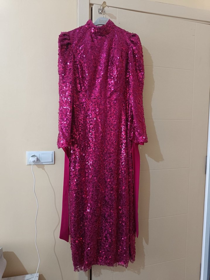Parlak pembe kumaş ve yılan deseniyle uzun, fitted abiye elbise. Yüksek yakalı, uzun kollu ve drapeli tasarımıyla gösterişli bir parti kıyafeti. ✨