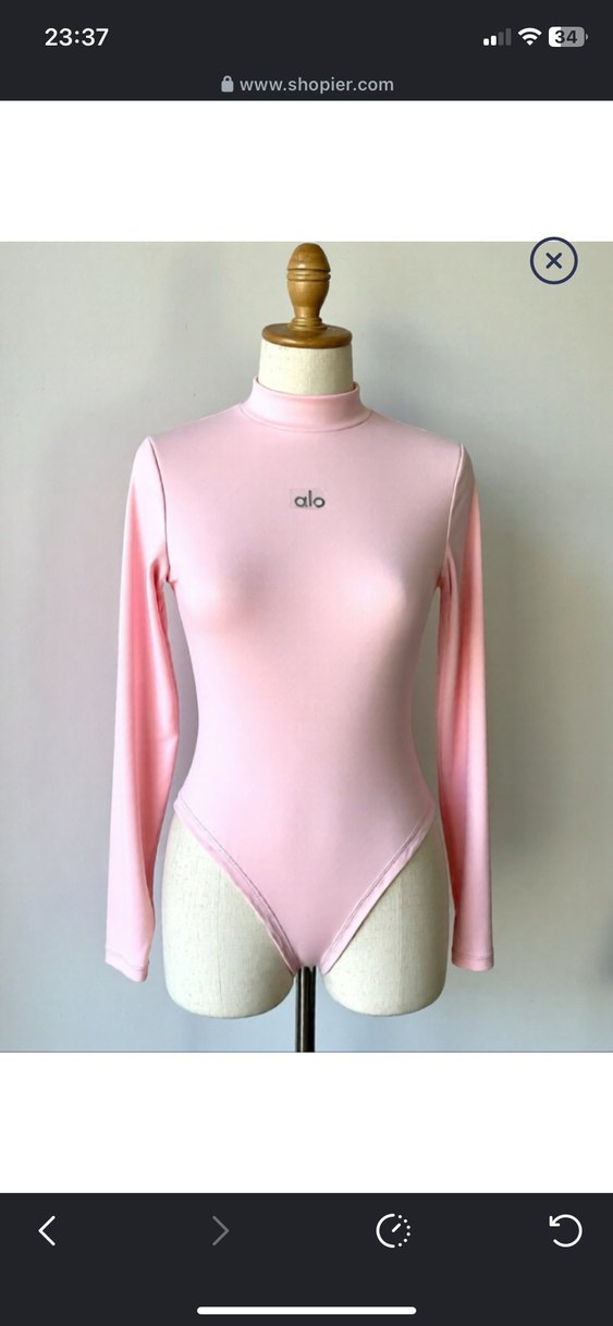 Pembe, uzun kollu ve yüksek yakalı, vücuda oturan bu bluz, düz ve yumuşak sentetik kumaştan yapılmıştır. Göğüste 'alo' logosu vardır, günlük sokak stili için uygundur.