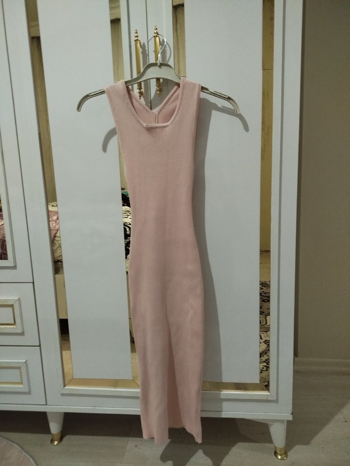 Kolsuz, yüksek yakalı, pembe uzun triko elbise. İnce ve vücuda oturan kesimiyle minimalist ve zahmetsiz şıklık sunar. Günlük kullanım için uygundur.