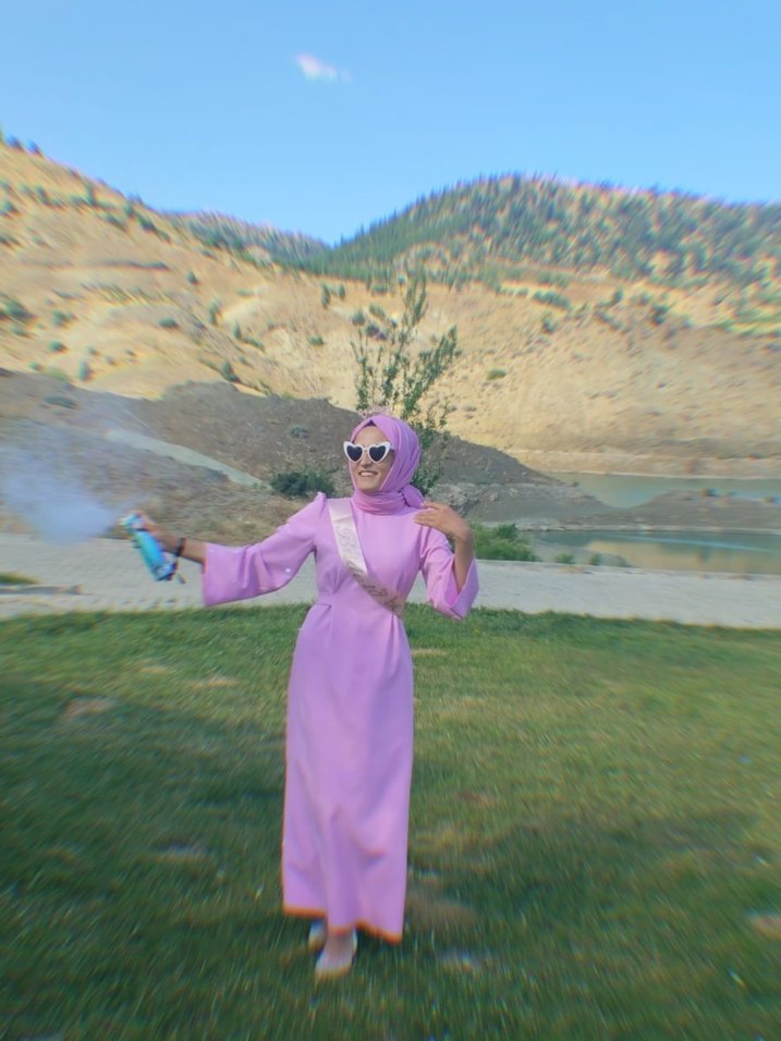 Pembe pastel renkte, yüksek yakalı, uzun kollu sentetik kumaştan yapılmış uzun elbise, rahat ve modest kesim. Çok iyi durumda bir kere giyildi.